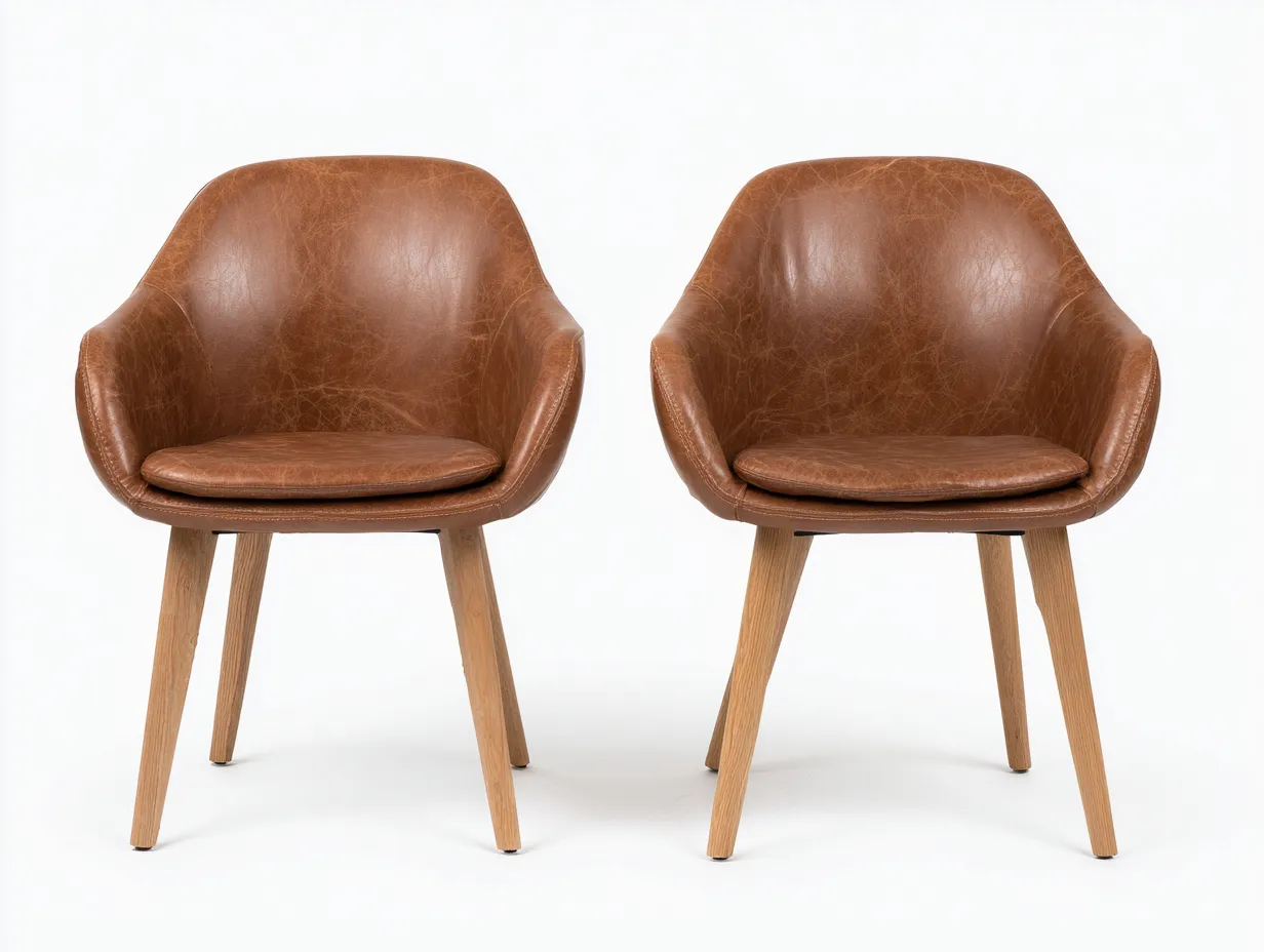Struttura portante realizzata in legno massello con finitura naturale. Seduta e schienale imbottiti rivestiti in ecopelle di colore marrone con superficie leggermente testurizzata e bordi rifiniti.